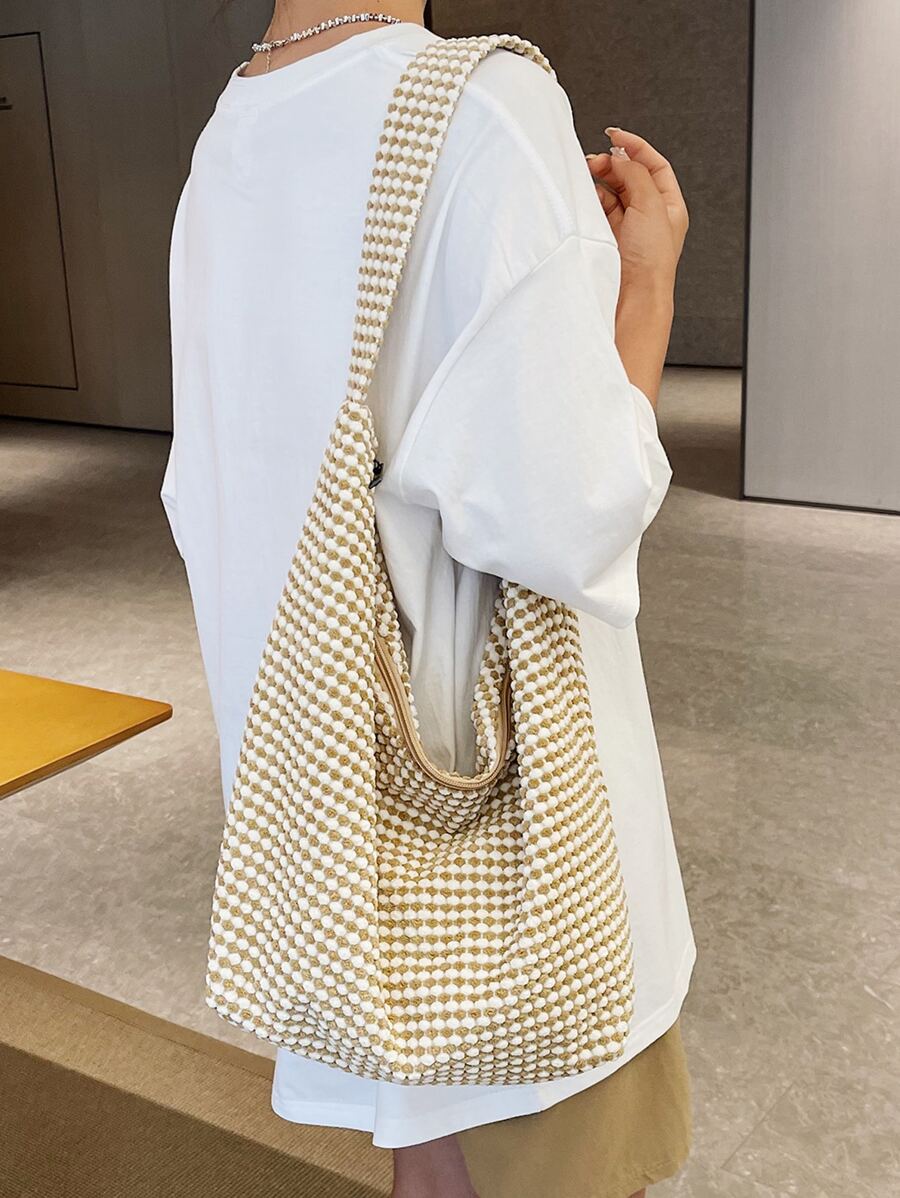 Esta bolsa de tecido apresenta uma estampa geométrica delicada, com padrões em tom bege e branco, que cria um visual moderno e minimalista. As alças trançadas oferecem um toque artesanal e confortável, ideal para carregar no dia a dia. O design prático e espaçoso permite o transporte de objetos essenciais com estilo e praticidade.